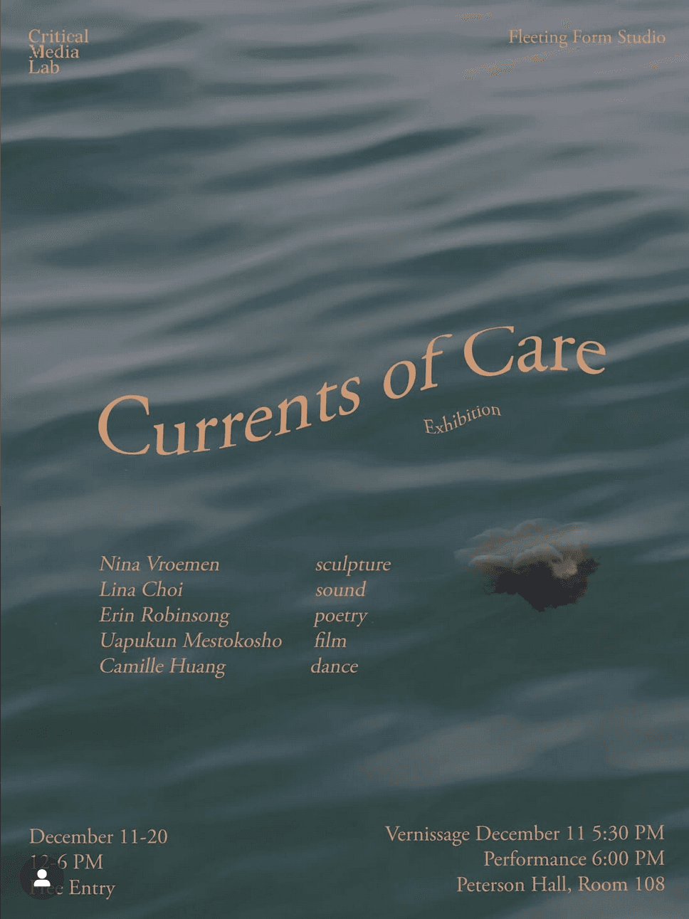 Presented at McGill’s Critical Media Lab, this exhibition moves through art, environmental history, and speculative practice to reflect on waterways as sites of both rupture and regeneration. Artists and research-creators explore the poetics of care in times of ecological crisis, foregrounding the fullness and abundance of water life-worlds amid narratives of scarcity and inanimacy. Through video, installation, sound, and text, Currents of Care invites audiences into imaginative engagements with water that defy linear time and instrumental valuation.