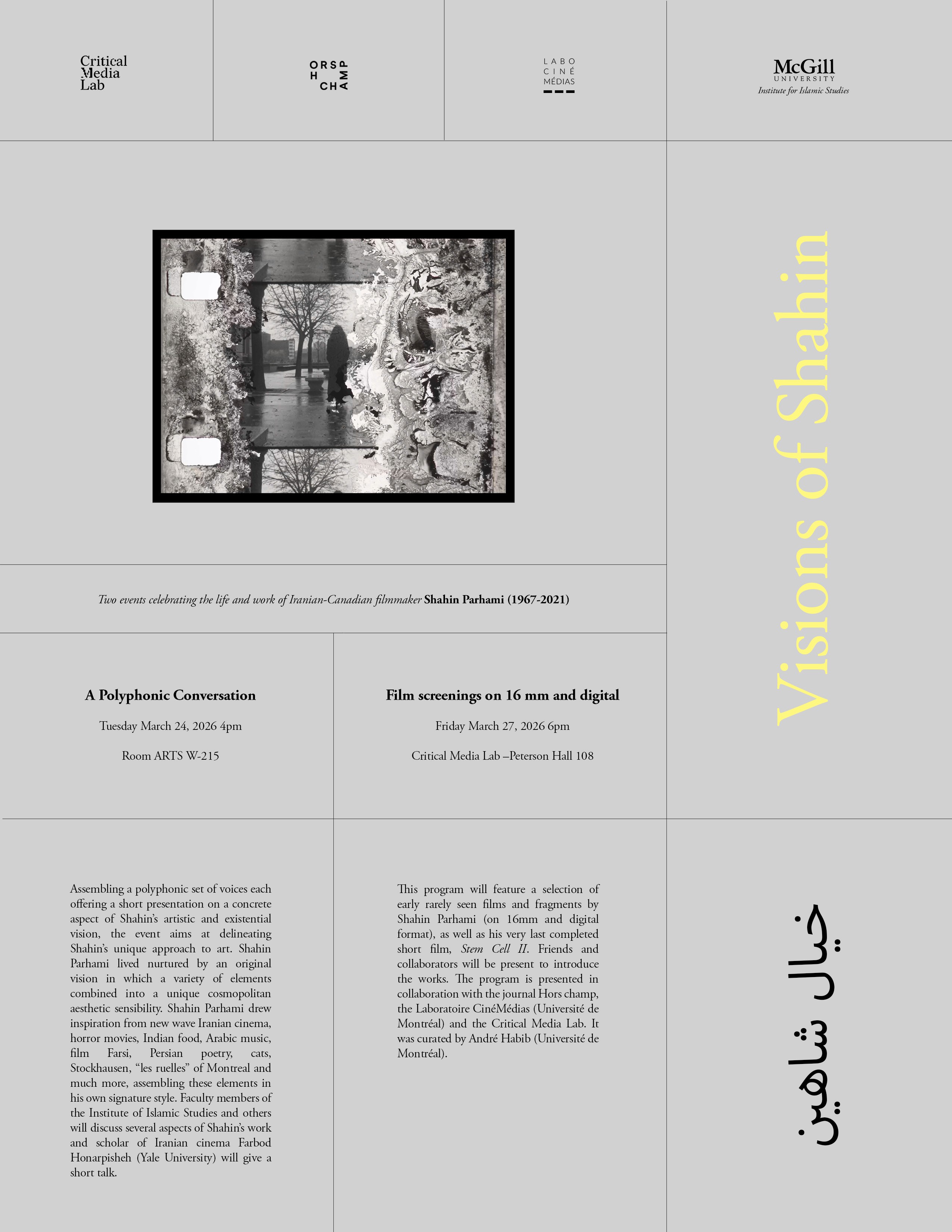 Réunissant un ensemble de voix qui présenteront chacune un aspect concret de la vision artistique et philosophique de Shahin, cet événement vise à décrire son approche unique de l'art. Shahin Parhami a vécu nourri d'une vision originale dans laquelle divers éléments se combinaient pour former une sensibilité esthétique et cosmopolite unique. Il a puisé son inspiration dans le cinéma de la nouvelle vague iranienne, les films d'horreur, la cuisine indienne, la musique arabe, le Film Farsi, la poésie persane, les chats, Stockhausen, les ruelles de Montréal et de bien d'autres choses encore, assemblant ces éléments pour former un style singulier. Les membres du corps professoral de l'Institut d'études islamiques et d'autres intervenants discuteront de plusieurs aspects de l'œuvre de Shahin, et le spécialiste du cinéma iranien Farbod Honarpisheh (Université Yale) donnera une brève conférence.
